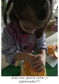 E o venres, para rematar a semana, fixemos zume de laranxa: colocamos os bancos arredor de dúas mesas onde Vito e María puxeron laranxas, un espremedor eléctrico, una táboa de cortar, una xerra de plástico, vasiños de plástico e palliñas e servilletas. Ao carón das mesas colocaron o lixo orgánico para botar os restos das laranxas. Tiñamos todo listo para comezar así que, logo de lavar as mans, un por un fomos pasando pola mesa para espremer unha laranxa! Cando tivemos moito zume, Vito botounos un pouquiño no vasiño pero como estaba tan saboroso tivemos que repetir!